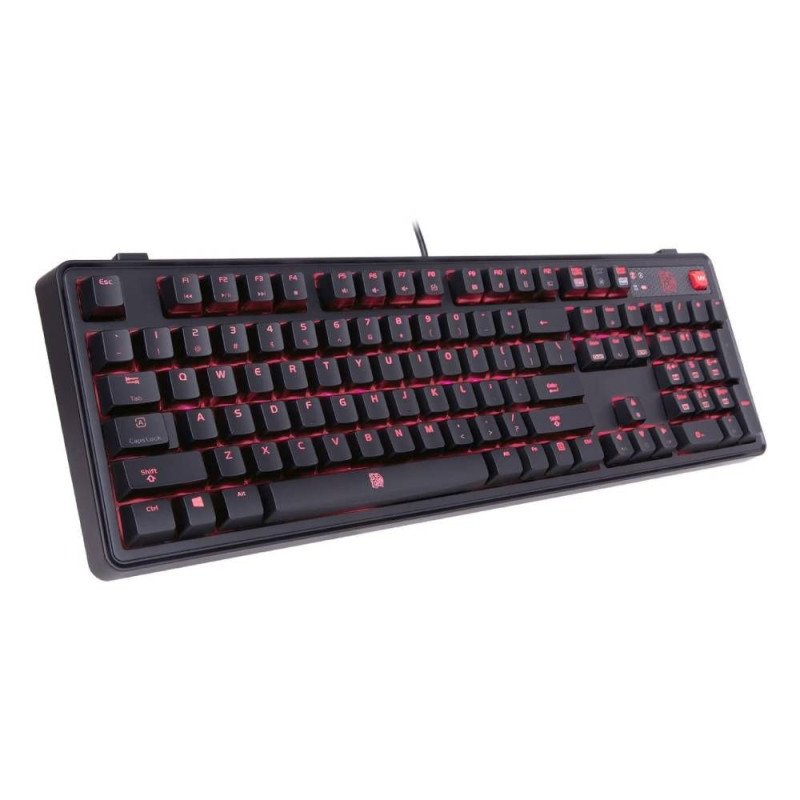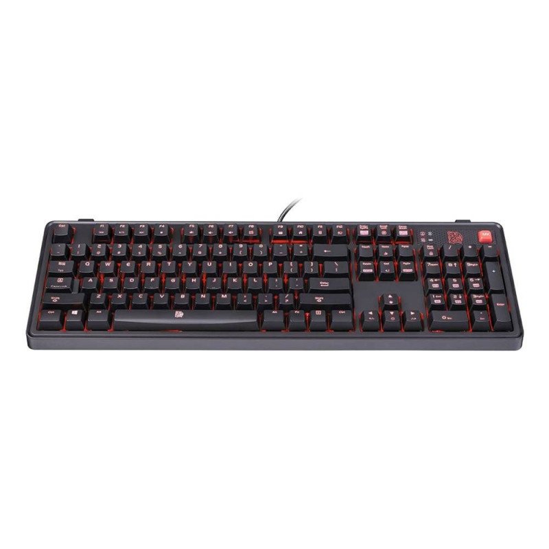 El teclado Thermaltake es un teclado para juegos Cherry MX 100% con contacto chapado en oro y 50 millones de pulsaciones de teclas, uno de los interruptores lineales para una acción ligera y suave con una resistencia mínima. Cuenta iluminación LED roja totalmente retroiluminadas con 6 efectos de iluminación. Los interruptores también vienen clasificados con una vida útil de 50 millones de pulsaciones para una máxima durabilidad.